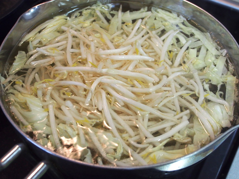二郎系と言えば大量のキャベツとモヤシ!スープの隣で茹でます。1口コンロの場合は、スープ湯煎→別に沸かしたお湯につけておく→その間に野菜、麺を茹でる→最後にもう少しだけスープを湯煎する、で良いですね。