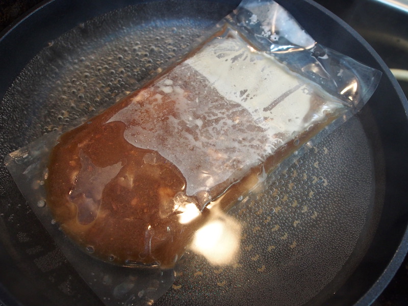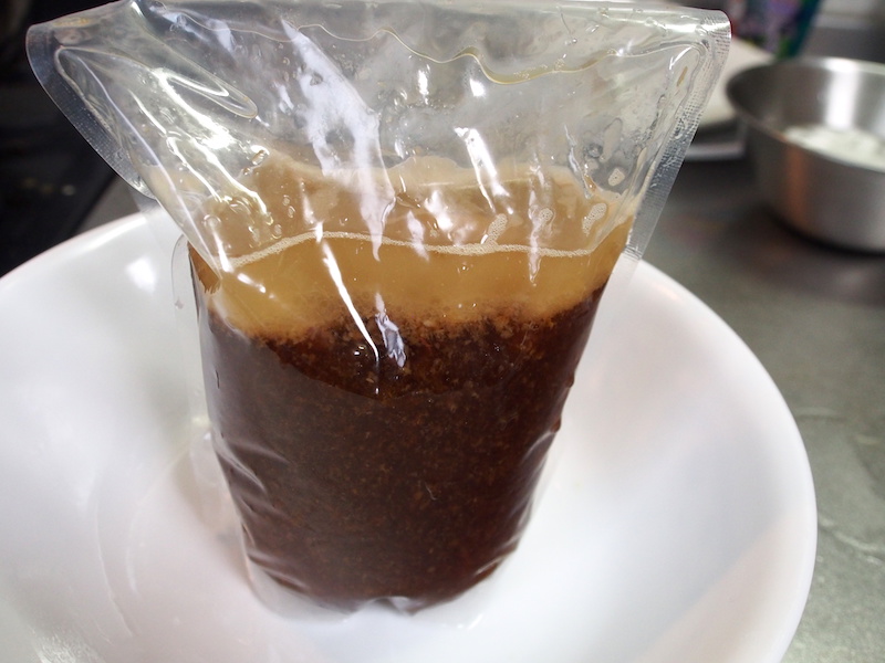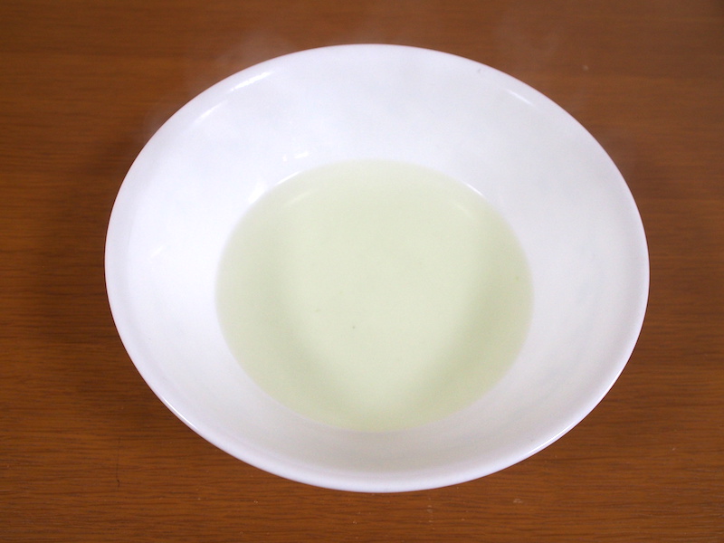 さて、いよいよ湯煎していたスープを取り出します。気持ち、振ってから丼に投入します。