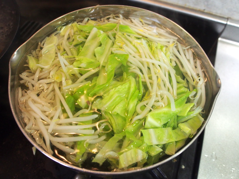 二郎系と言えば大量のキャベツとモヤシ!スープの隣で茹でます。1口コンロの場合は、スープ湯煎→別に沸かしたお湯につけておく→その間に野菜、麺を茹でる→最後にもう少しだけスープを湯煎する、で良いですね。